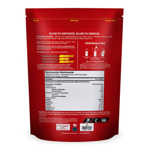 Electrolitos en polvo con carbohidratos y vitaminas (bebida isotónica) a base de ingredientes naturales de rápida absorción, especialmente formulada para deportes de fuerza y potencia (altos índices de sudoración, alta resistencia y acíclicos) que repone 5 electrolitos esenciales perdidos por el sudor durante el ejercicio (sodio, potasio, magnesio, calcio y cloruro) y abastece rápidamente a los músculos de glucógeno que puede convertirse en combustible cuando se necesite. Sabor: Ponche de frutas.