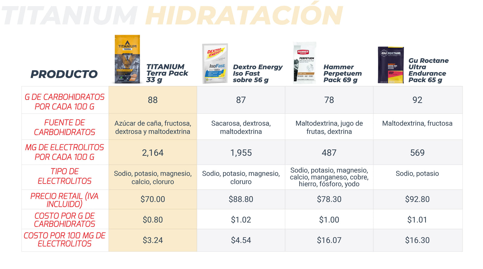 Mismos beneficios de TITANIUM TERRA, también disponible en bolsas de 700 gramos para 30 porciones de 500 mililitros (en total 15 litros o 4 galones de hidratación).